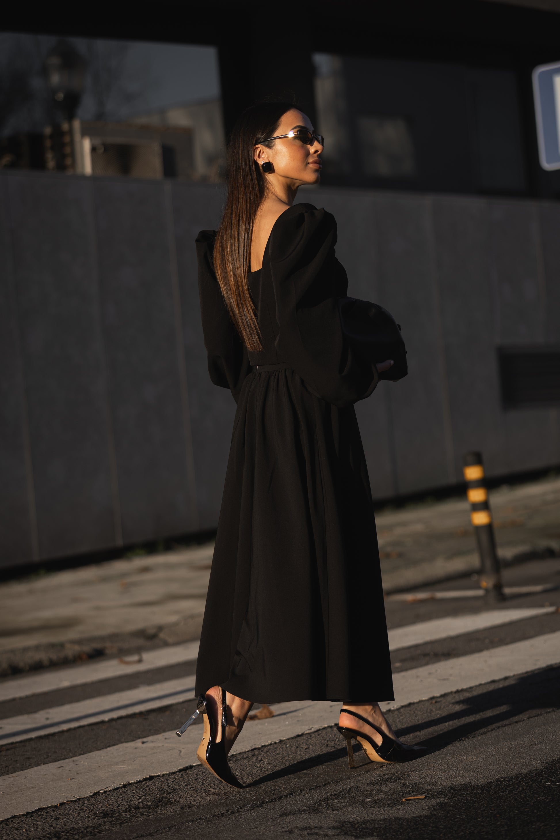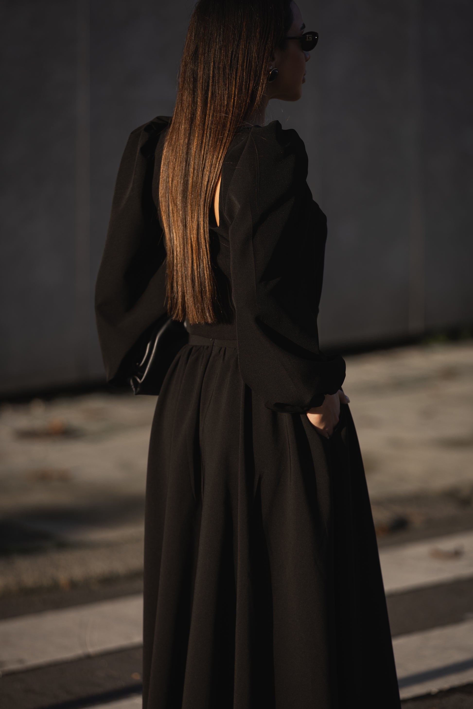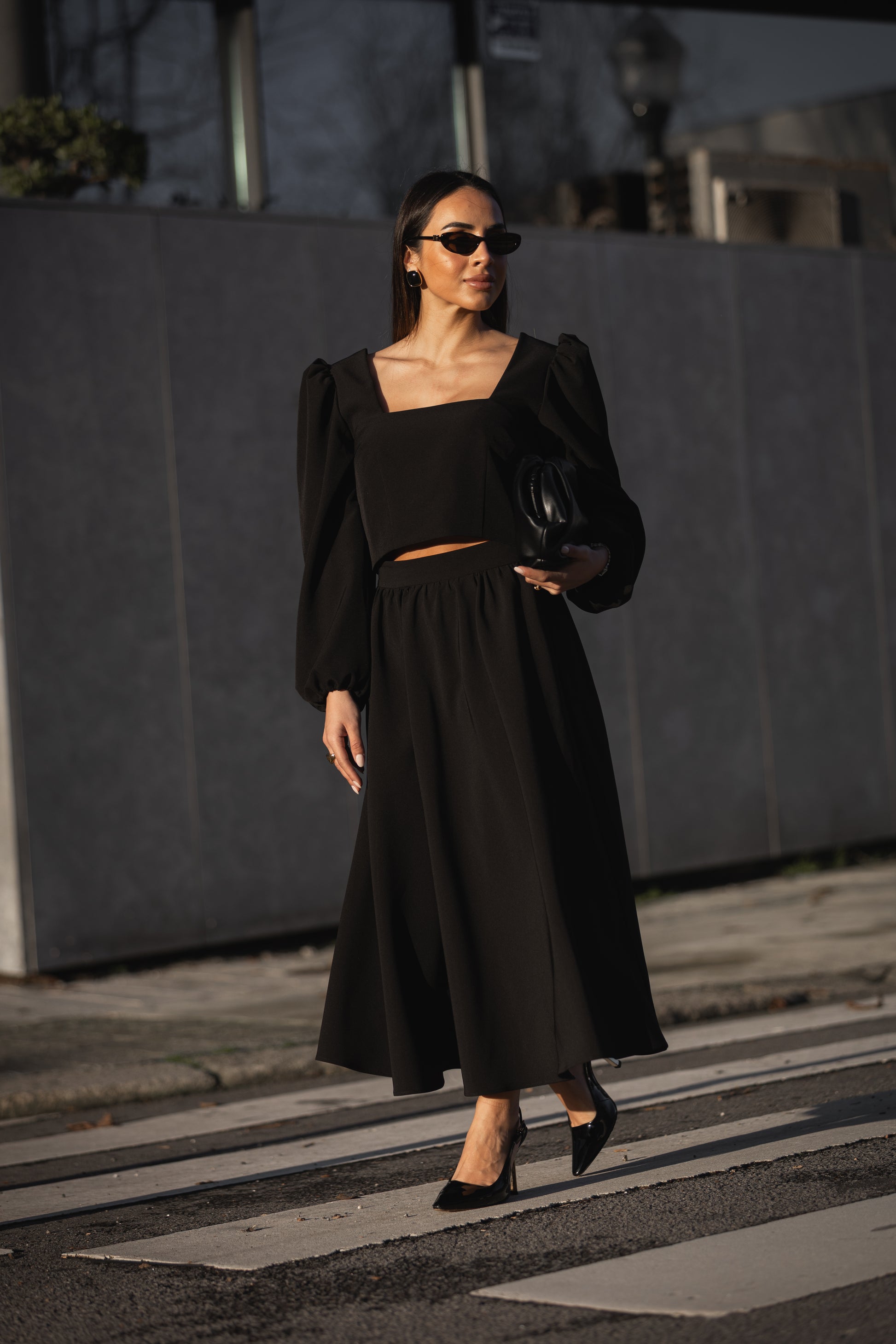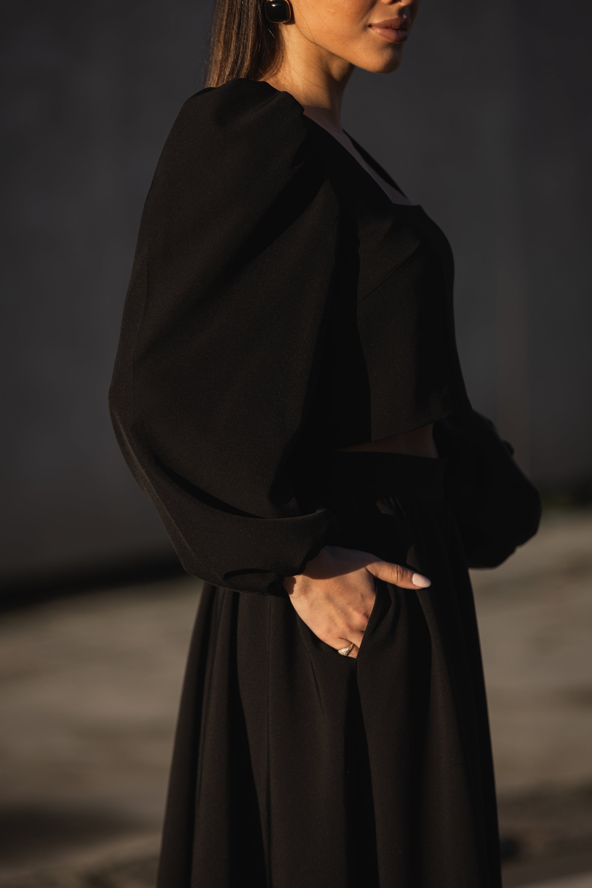 Tecido: crepe com elastano, textura intermédia, toque macio
