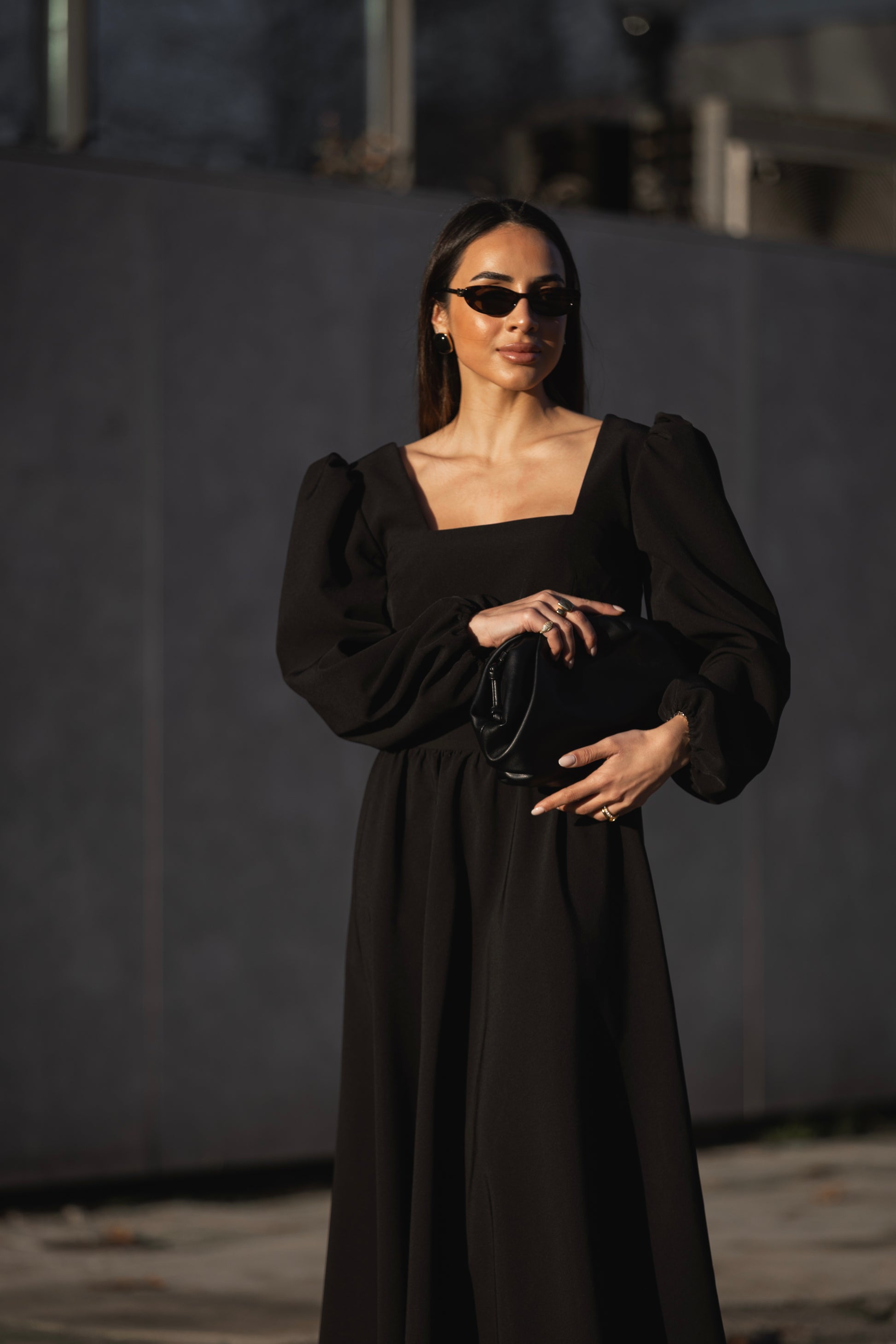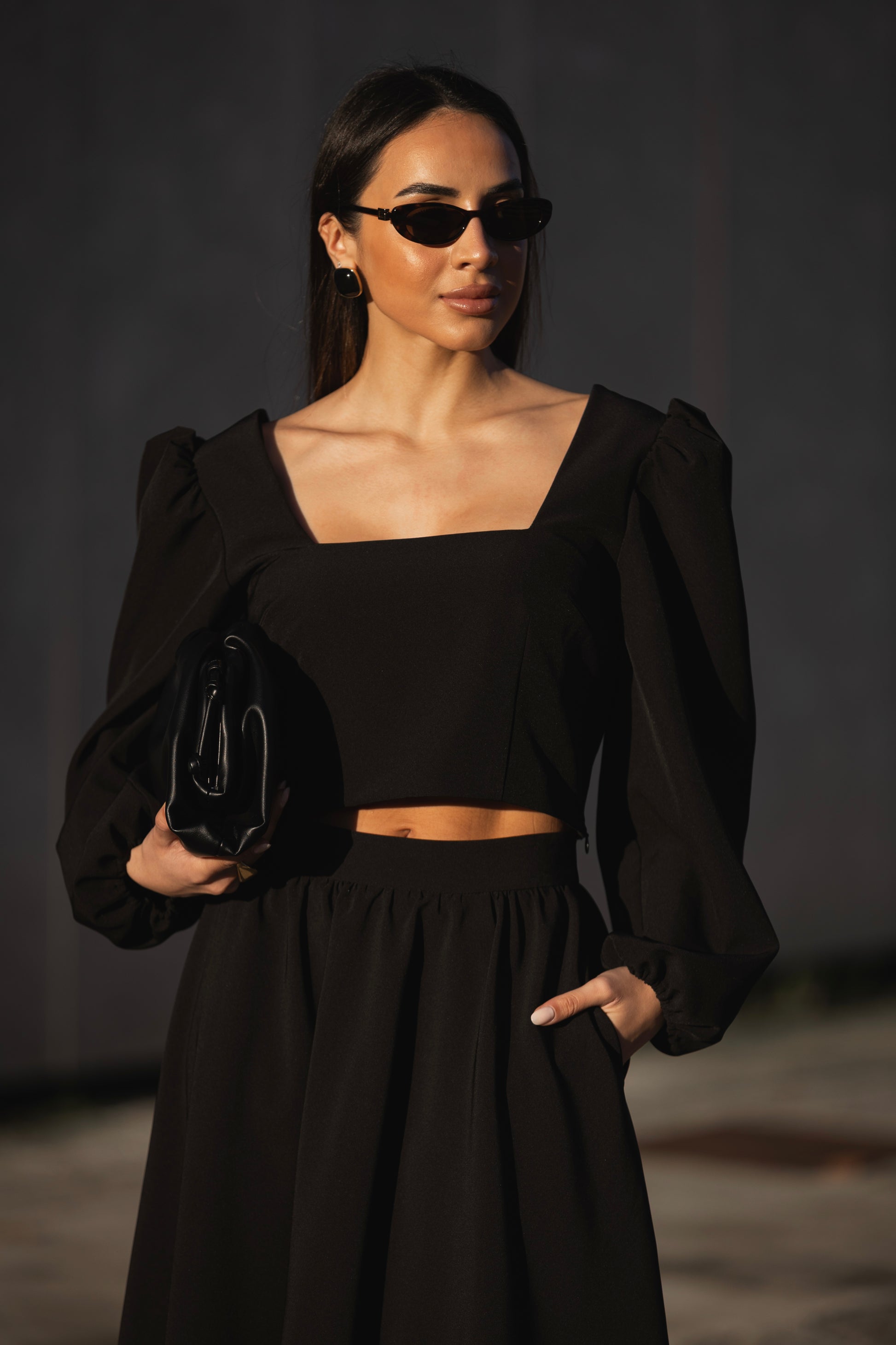 A modelo veste S e está com o tamanho S.